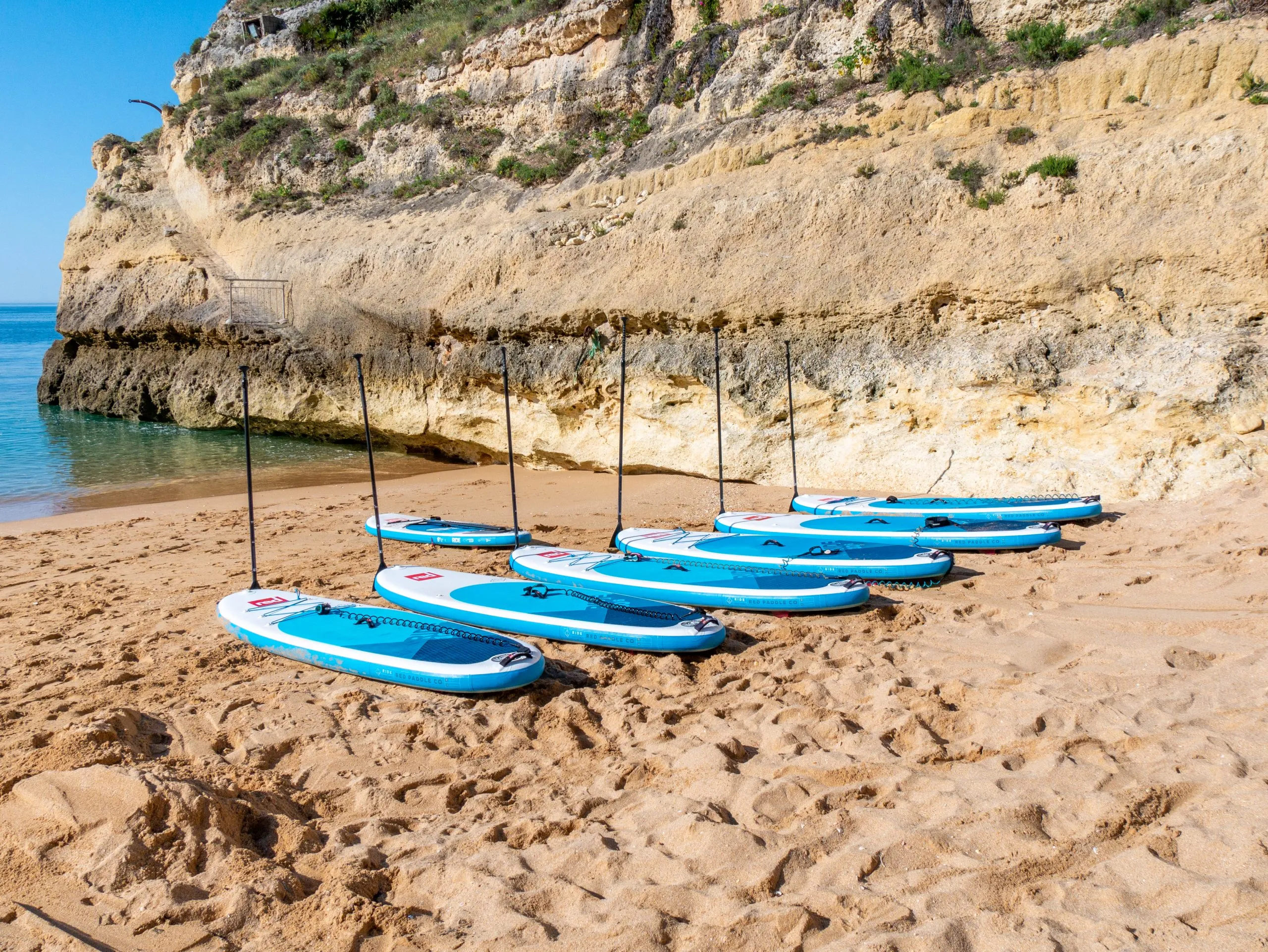 Essayez le SUP au lever du soleil dans les grottes de l'Algarve, Benagil est très populaire, ce circuit est destiné aux lève-tôt qui aiment le calme des premières lumières, activité simple, adaptée à tous les niveaux